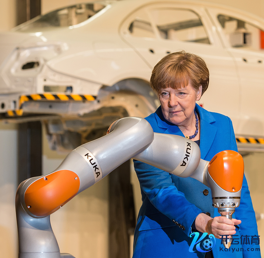 2015年3月13日,德国奥格斯堡,时任德国总理默克尔看望库卡工业机器东谈主分娩工场,躬行测试机器东谈主手臂。