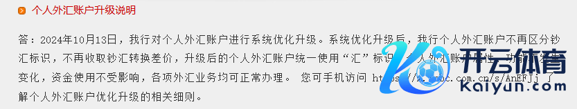 10月13日,工商银行对个东谈主外汇账户进行系统优化升级。系统优化升级后,该行个东谈主外汇账户不再辞别钞汇鲜艳,不再收取钞汇调度差价,升级后的个东谈主外汇账户结伙使用“汇”鲜艳。个东谈主外汇账户属性、功能不发生变化,资金使用不受影响,各项外汇业务均可平淡办理。