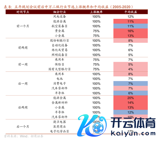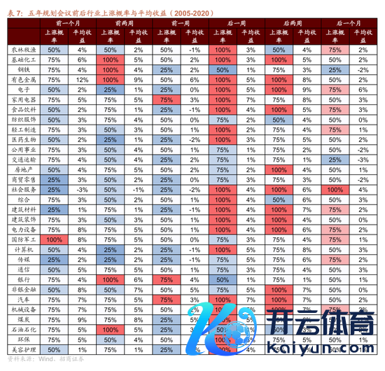 从行业推崇来看,五年盘算会议前一个月国防军工题材相对占优,会议后一至两周为行情蚁合爆发期,多个行业飞腾。会议前一个月,国防军工飞腾概率和平均收益相对较高。会议前两周,有色金属、银行飞腾概率和平均收益相对较高。会议前一周,无数行业飞腾概率和收益显耀松懈,其中银行相对较高。会议后一至两周,中游制造业中,基础化工、电力拓荒、汽车、机械拓荒等飞腾概率和平均收益相对较高;铺张中,食物饮料、社会作事等飞腾概率和收益相对占优;TMT中,电子推崇相对占优。会议后一个月,商场飞腾行情缓缓不休,仅社会作事飞腾概率和收益相对较高。