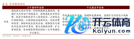 在扩内需方面,相较于十九届五中全会,本次公报有两大变化。一是提到了“坚握惠民生和促铺张、投资于物和投资于东说念主紧密结合”,这意味着依然基本配置了通过惠民生来扩内需的这一根底旅途。二是对“颐养大商场”的措辞愈加执意。在此前的十四五盘算中,对“颐养大商场”用到的是“加速构开国内颐养大商场”,本次则是变为了“执意取销结巴宇宙颐养大商场陶冶卡点堵点”。