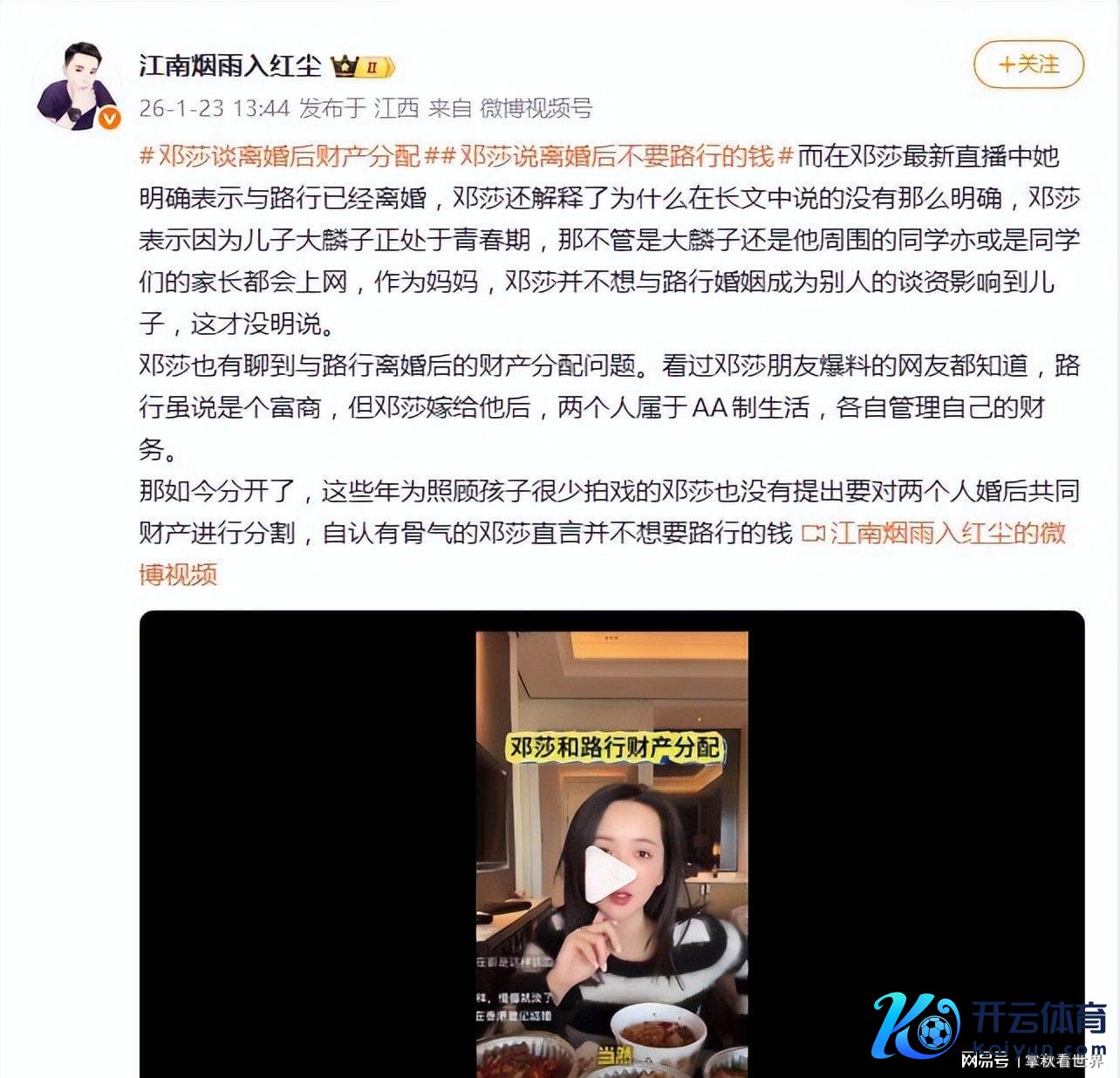 据1月23日网友爆料世界杯体育,“花我方的钱才智思干嘛就干嘛”——邓莎在直播间的这句硬核发言,径直把她和殷商前夫路行那段督察了14年的“AA制婚配”推上了风口浪尖。此次,她不仅初度明确承认离异,更以一句“不思要路行的钱”,给这场权门婚配的收场写下了最出人意象的注脚。