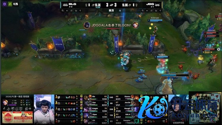 [21:08]河说念团战,knight辛德拉换掉Vampire锤石,随后小龙团,GALA被阿Bin鳄鱼裸露开大咬住溶解,Vampire锤石反手钩住knight,HongQ瑞兹反手双杀,xiaoxu纳尔变大裸露过墙,Xun满血蒙多追击越塔匡助阿Bin击杀xiaoxu,Xun再收Vampire,BLG打出2换5团灭JDG,经济跳跃1k。