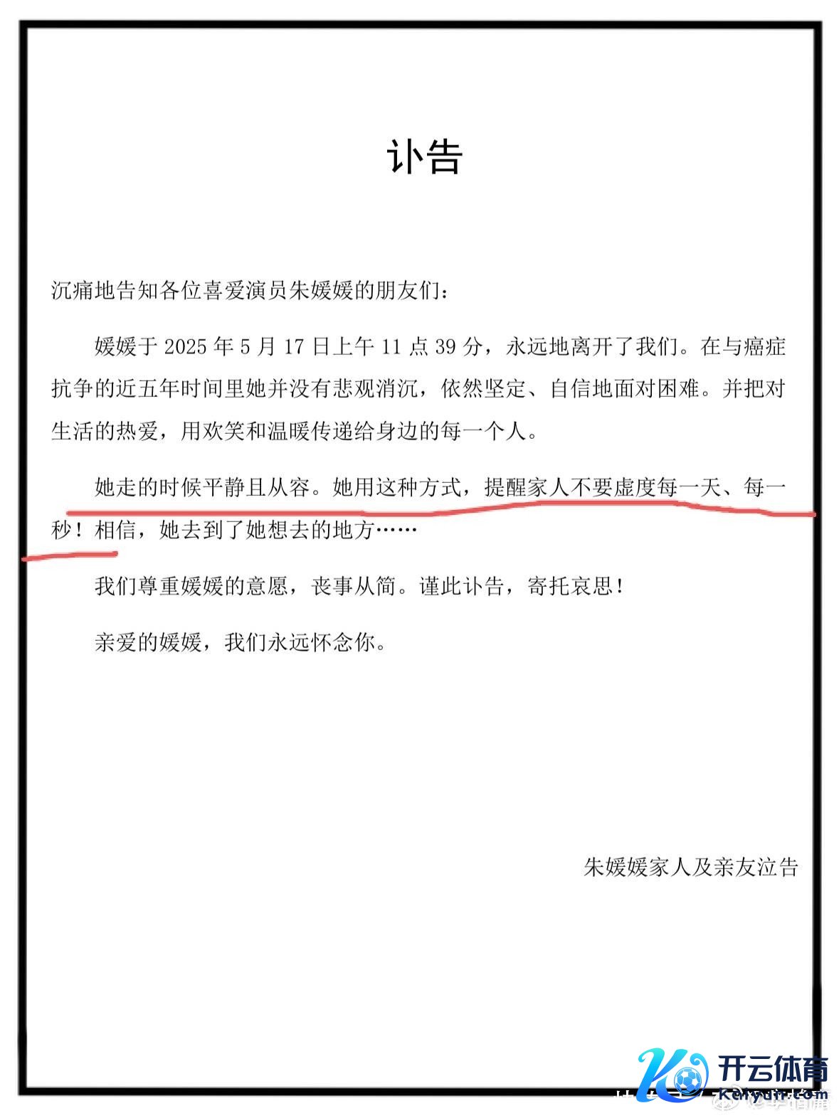 辛柏青在讣告中写谈:朱媛媛临终前最朴素的愿望,是但愿全球提神当下、不负光阴。