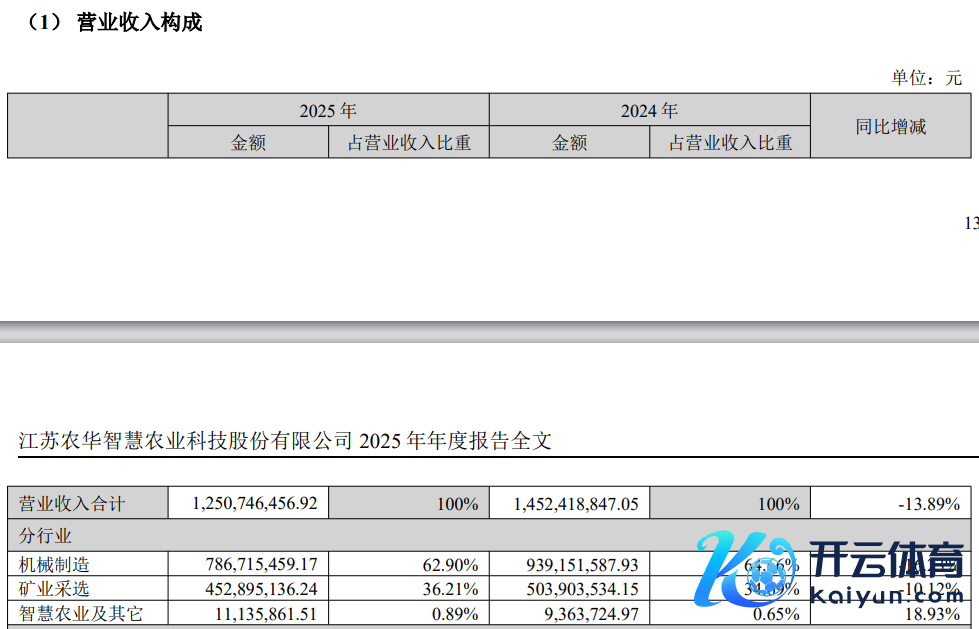年报“生意收入组成”流露,分行业来看,机械制造和矿业采用在营收上占比辞别为62.60%、36.21%,两者同比减幅均为两位数,是变成营收下滑的主因;灵敏农业偏激他在营收上虽有近19%的增幅,但营收占比仅0.89%,远不及以成为营收握手。